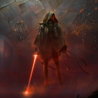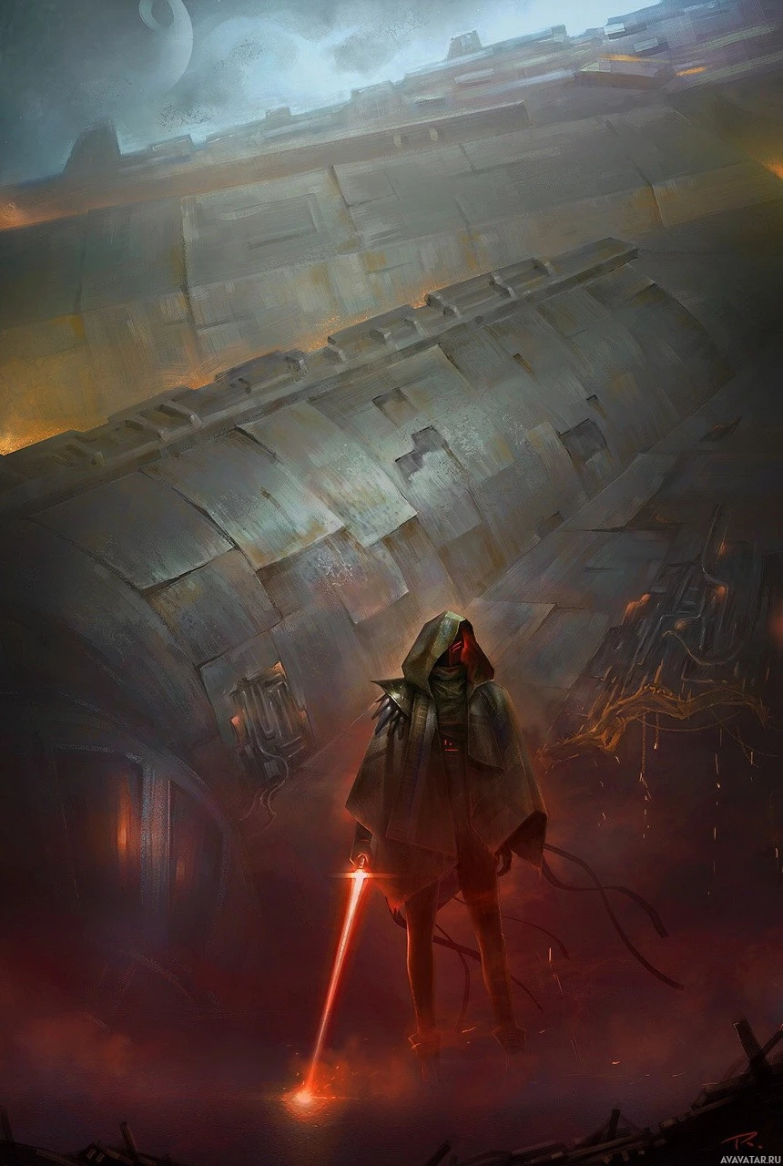the Star Wars franchise, given the style of the armor and the futuristic landscape. The character is holding what appears to be a lightsaber, further indicating a connection to Star Wars. The artwork has a dark, apocalyptic vibe, with smoke, fire, and destruction in the background, which adds to