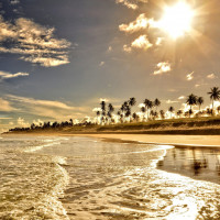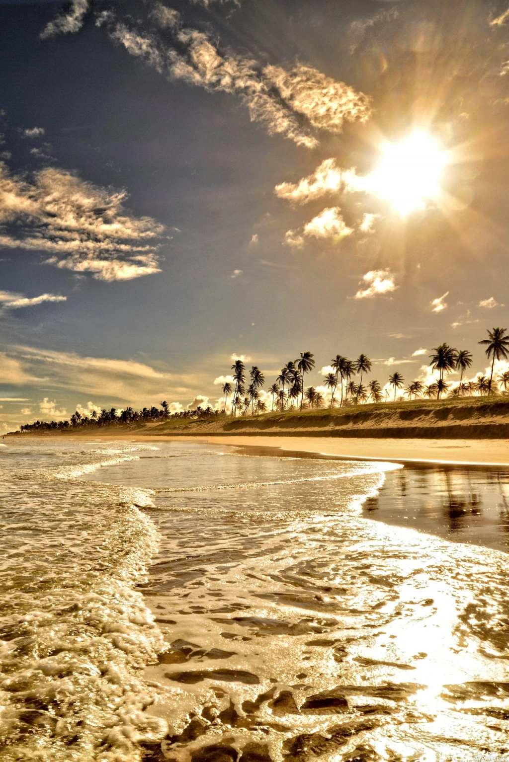 a beach scene with the sun setting on the horizon, casting warm hues across the sky. There are waves washing up onto the shore and some clouds scattered in the sky.