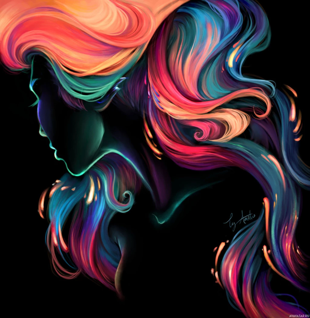 flowing hair in vibrant, colorful hues. Her hair transitions through