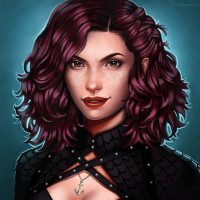 a dark top with lace details, possibly suggesting a fantasy or superhero theme. Her expression is neutral but attentive, and she has piercing eyes that look directly at the viewer. The overall style of the image is reminiscent of comic book artwork, emphasizing clean lines and