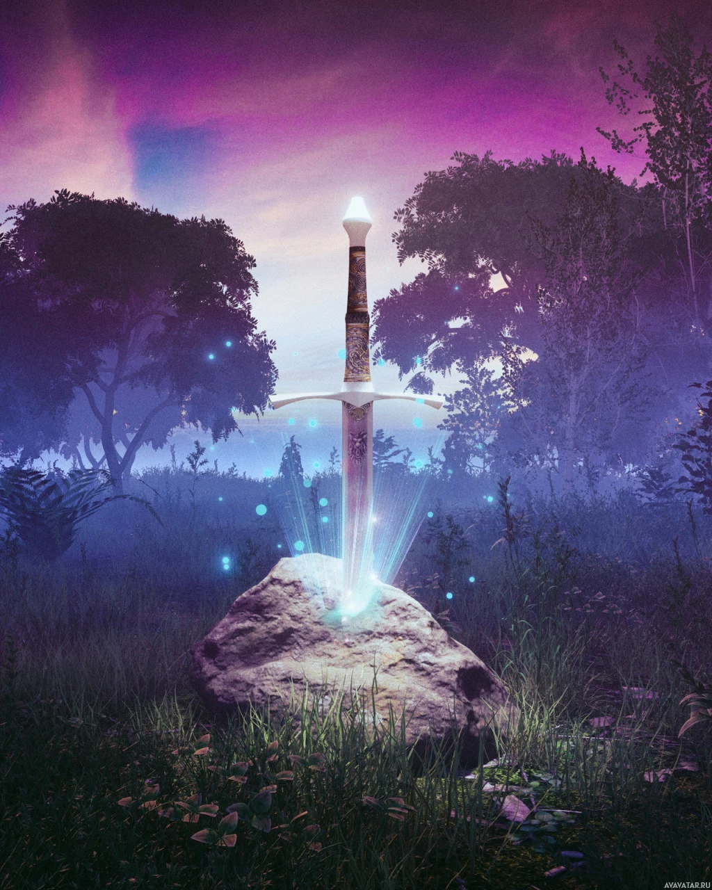 a glowing blade, suggesting that it might be enchanted or magical. Surrounding the rock are several small glowing blue sparks or lights floating around, which could indicate some sort of