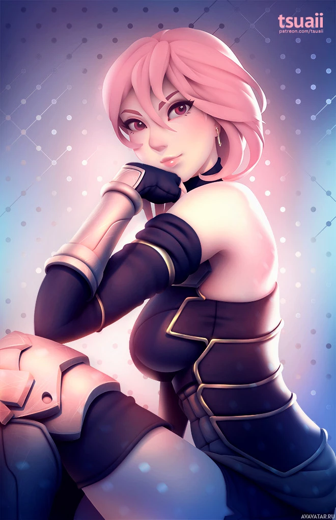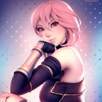 a female character with pink hair. She is depicted with