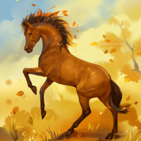 raised legs and tail blowing in the breeze. It's depicted in profile, with the horse facing towards the right side of the image. The overall scene has a vibrant and warm color palette, likely due to the golden