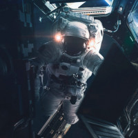 The image shows an astronaut in a spacecraft cockpit, looking out towards