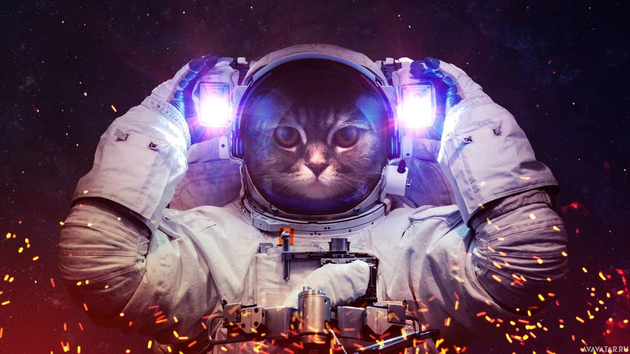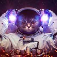 a space suit and helmet, with what appears to be the head of a cat superimposed onto their body. The setting looks like it could be from