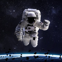 space suit with the helmet off. The background features a depiction of Earth and what appears to be stars or possibly