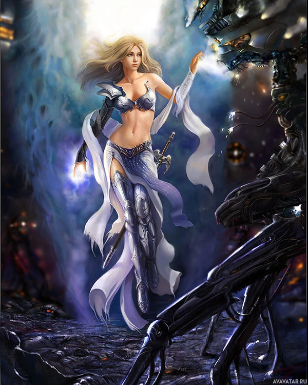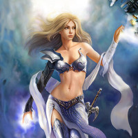 blonde hair and is depicted with an otherworldly appearance, suggesting she might be a character from a mythical or futuristic setting. The character is wearing armor and holding what looks like