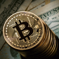 US dollars visible behind them. The Bitcoin symbols are prominently displayed on the coins, and there's an American 20 dollar bill placed among