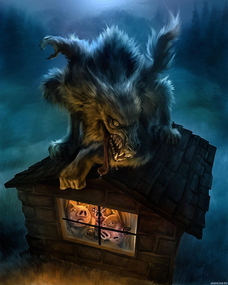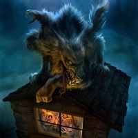 a fantastical scene with a wolf peering into a window of a cabin. The setting is dark and ominous, suggesting a night-time or Halloween theme. Inside the cabin, there appears to be another creature, possibly a werewolf, looking out from the window. The art style gives it a gothic or horror vibe, common in stories such as fairy tales that feature wolves and other