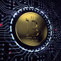 Bitcoin symbol at the center, surrounded by an array of circuit-like patterns that could represent the digital nature of cryptocurrency transactions. The overall design conveys a sense of