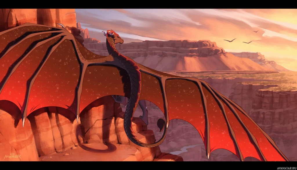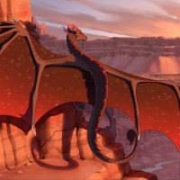 a rocky outcropping at sunset or during twilight, with a warm sky in the background. It appears to be a scene from a fantasy-themed animation, showcasing a character that could likely be a dragon due to its