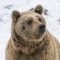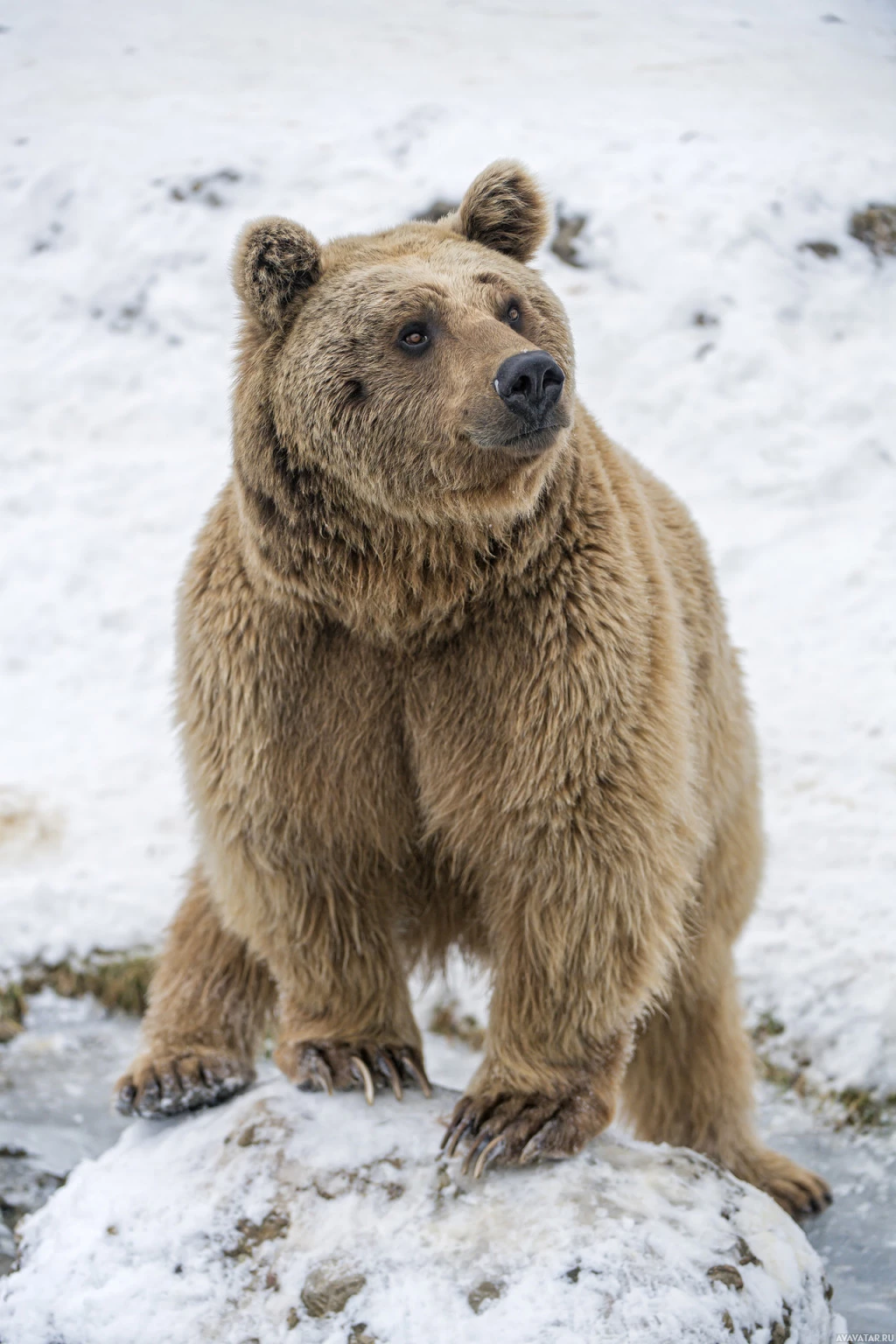 На картинке изображен бурый медведь, стоящий на задних лапах. Похоже, что он находится в естественной обстановке, вероятно, рядом с водоемом или льдом из-за присутствия снега и камней. Медведь смотрит прямо в камеру с оповещением. Эта картина может быть использована в образовательных целях или для освещения вопросов, связанных с сохранением дикой природы и среды обитания.