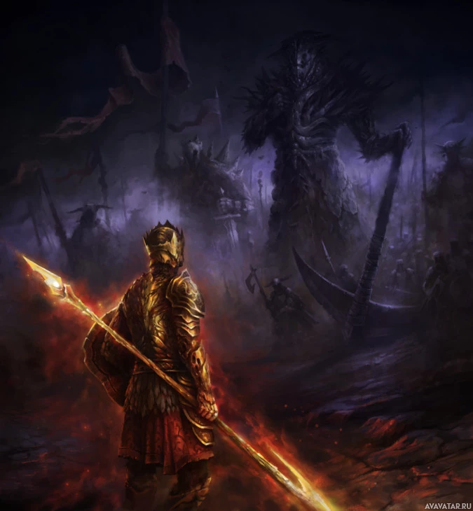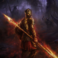 a battle scene with a figure that appears to be a warrior from an ancient civilization. This warrior is holding a spear, standing on what looks like a volcanic