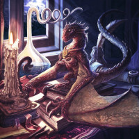 a small skull or figurine in its hand. In front of the creature is a table laden with