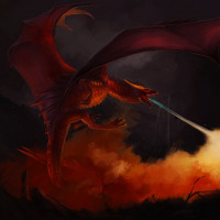 red scales and its wings are spread wide. In the background, there are explosions, suggesting a chaotic or battle-like setting. The artwork conveys