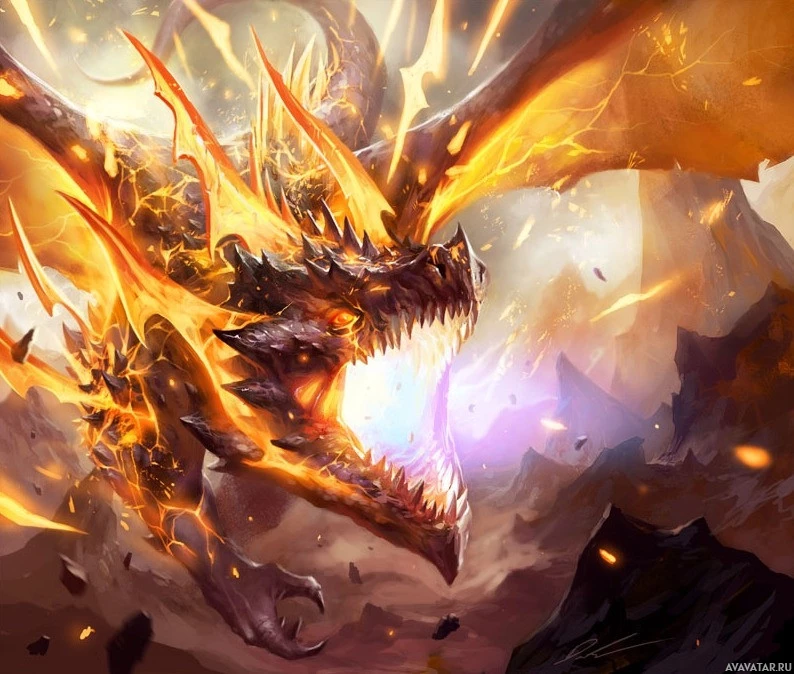 a powerful creature, possibly in the midst of roaring or breathing fire. The background suggests an intense