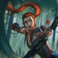 red hair. The elf is equipped with a bow and arrow, suggesting they are either hunting or preparing for battle. They are in