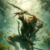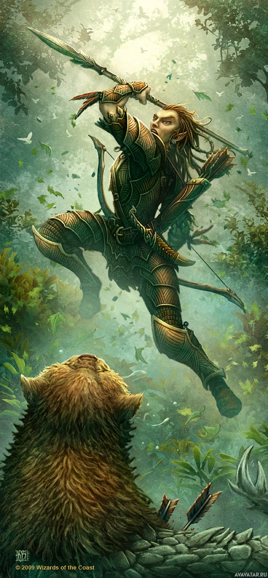 a fantasy scene featuring an elf character. The elf is equipped with a lance and appears to be riding on