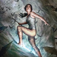 the video game series "Tomb Raider." She is shown in an action pose with one hand gripping a weapon that looks like a spear or trident. The background features dark and moody colors, with numerous bats flying around her and
