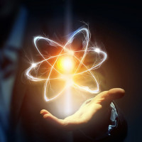 a glowing sphere that contains a scientific symbol, which is commonly associated with nuclear physics or atomic energy. The background is dimly lit and appears to be indoors with