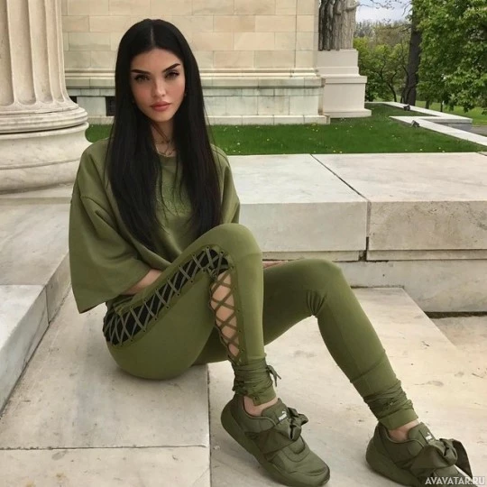 The image shows a woman sitting on steps. She appears to be wearing an olive green outfit with matching sneakers, and she has long