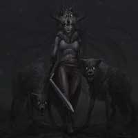 a female character standing in the center, holding a sword. She is surrounded by two wolves that appear to be her companions or familiars. The character has pointed ears and what seems to be horns on her head, suggesting she might be a supernatural creature, possibly a werewolf or similar