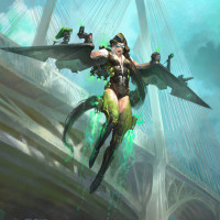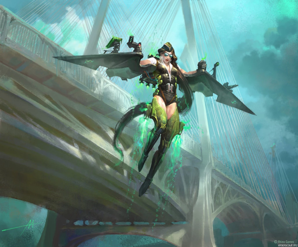 green wings that are spread behind her back, suggesting she may have some form of magical or fantastical powers. The character is standing on a bridge with an intricate design, which could be indicative of advanced architecture in