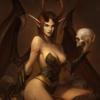 The image features a fantasy-themed illustration of a woman with demonic features. She is seated among what appears to be