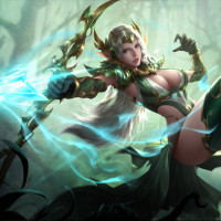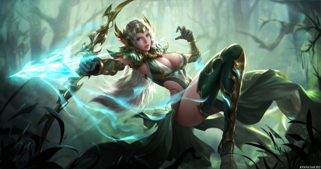 The image depicts a fantasy-themed character that appears to be an elf. She is equipped with a bow and seems to be in
