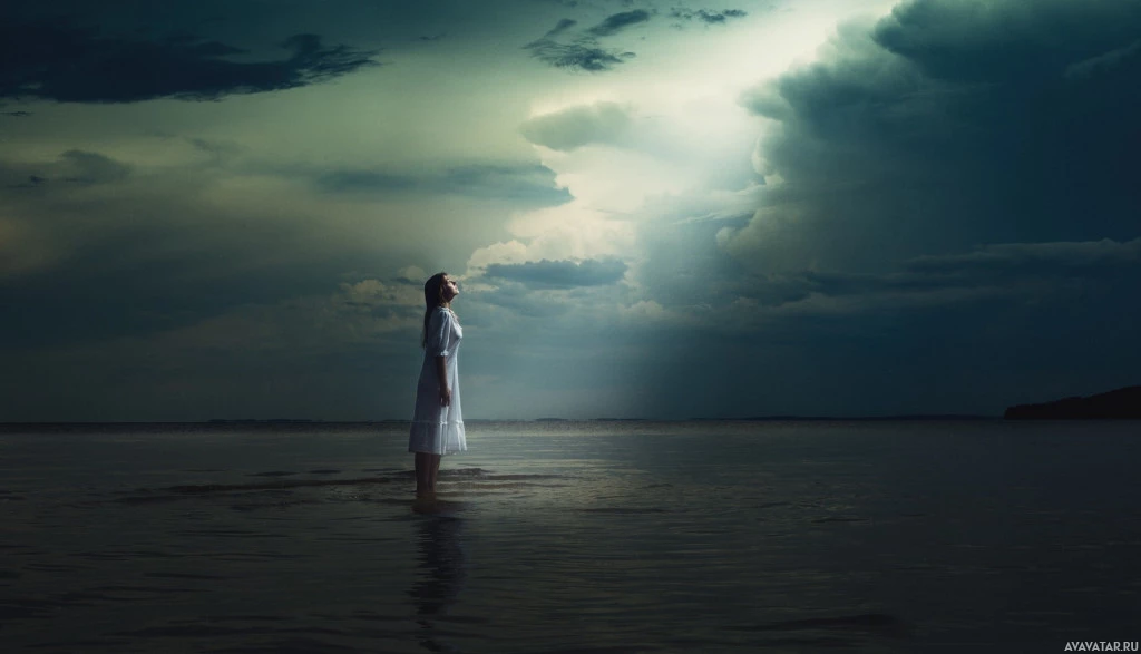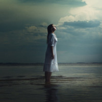 a body of water. She is looking upwards and outward, possibly at the sky or into the distance. The scene suggests