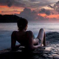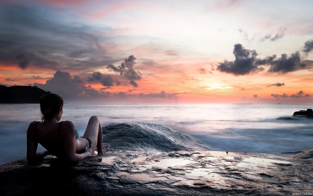 The image shows a person sitting on some rocks near the ocean, enjoying a sunset. It appears to be taken from behind the individual, with a view of