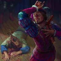 historical clothing, possibly inspired by Elizabethan fashion, who appears to be performing or playing a lute. In contrast, another character, known as Dandelion within the game, is lying on the ground with his hands raised above his head as if he were singing or speaking, but he's also holding a knife that seems to be embedded in his side. There's