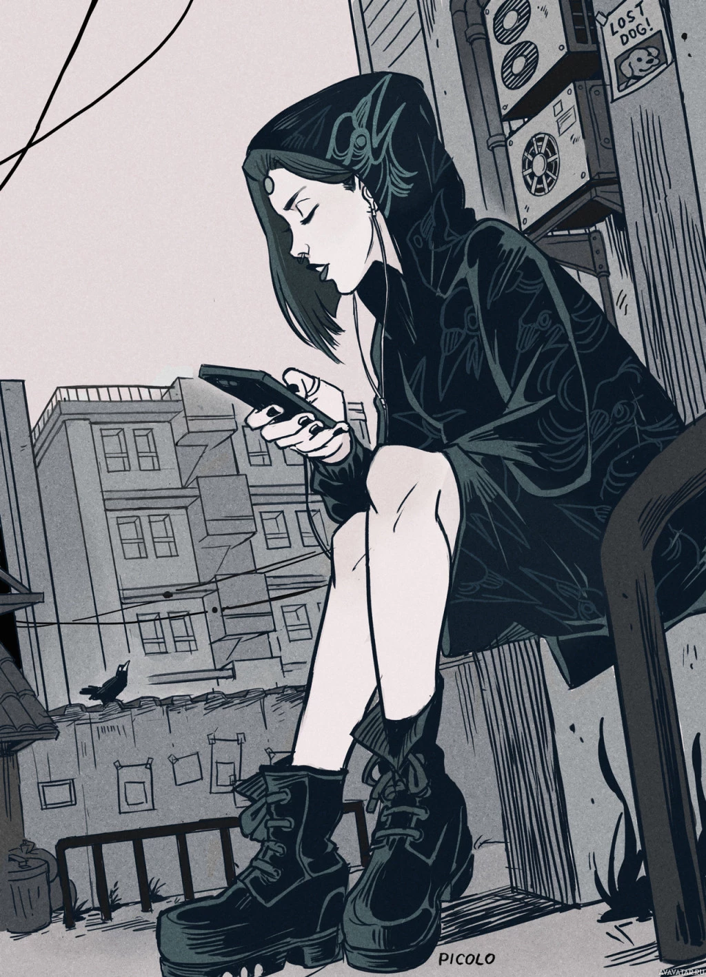 The image features an illustration of a girl sitting on what appears to be a ledge or wall. She is wearing a hooded jacket, boots, and has her eyes closed. In her hands, she holds a smartphone. The setting looks like an urban alleyway or street with buildings in the background.