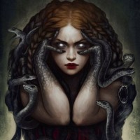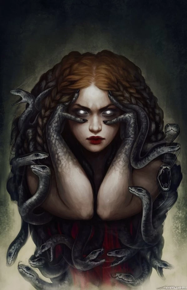 The image depicts an artistic representation of a figure known as Medusa, a gorgon from