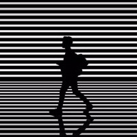 The image depicts a silhouette of a person walking away from the viewer, with their back to us. This creates a sense of mystery and anonymity as we don't know who the individual is or what direction they are heading in. The background consists of vertical stripes that give a sense of motion or speed, which may be enhancing the feeling of the person walking at high speed.
