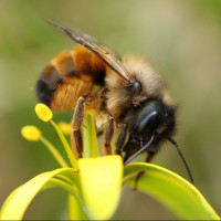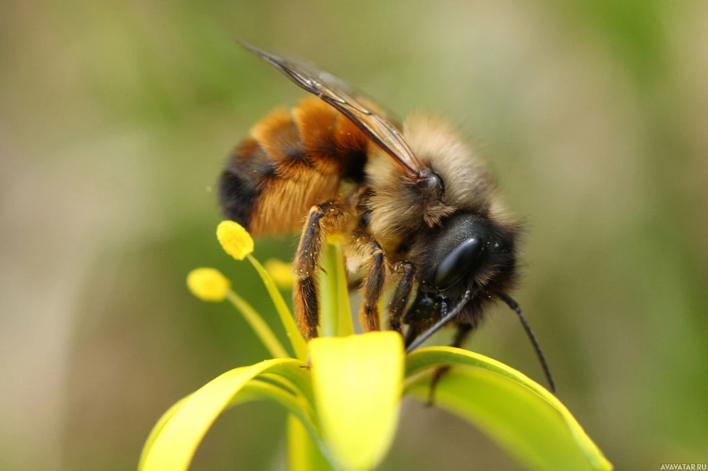 На этом изображении пчела сидит на вершине желтого цветка. Пчела кормит или осматривает цветок. Сцена, кажется, находится на открытом воздухе в природе.