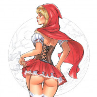 a female character drawn in a style reminiscent of classical animation or comic art. She is depicted from behind, wearing a hood that resembles Little Red
