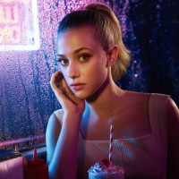 blonde hair styled in a side parting, wears makeup, and appears to have their hand under their chin, which might indicate a thoughtful or contemplative pose. The overall ambiance is moody and dimly lit, contributing to a relaxed or introspective mood.