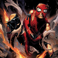 muscular build, and there are visible scars on his face that add to the grittiness of the portrayal. He stands against a backdrop that includes elements such as fire and smoke, which gives the impression of a chaotic or intense scene. The character is shown in mid-action, suggesting movement and dynamism.