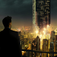 the urban landscape below. The background shows a prominent skyscraper with a unique architectural feature: it has a large,