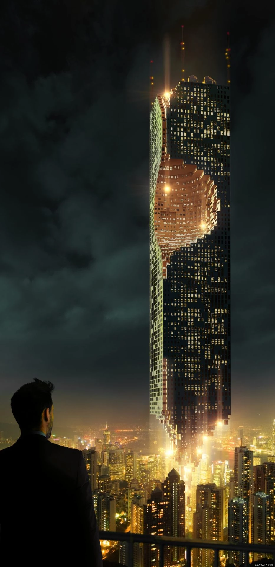 spherical object embedded into its side. The cityscape itself suggests a setting that could be an advanced version of a major metropolis, possibly
