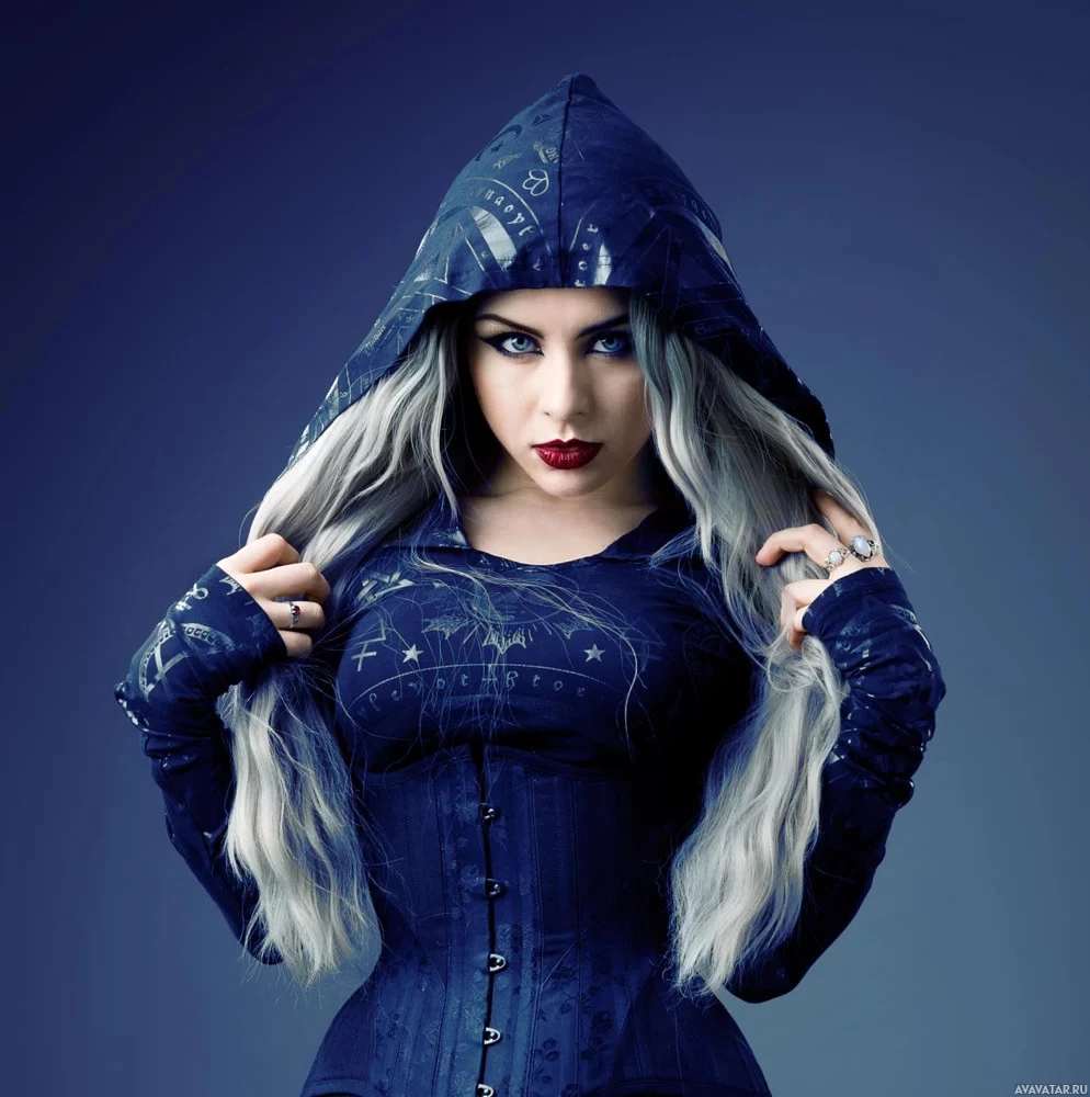 white hair and are looking directly at the camera with a serious expression. The individual's appearance is quite striking and could be associated with various subcultures like gothic or