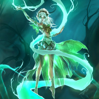 magical creature, depicted in an ethereal and mystical setting. The character is adorned with green feather-like garments and has