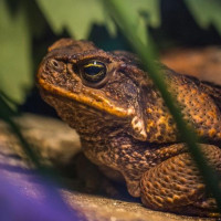 natural habitat. It's sitting on what appears to be a rock, surrounded by plants and possibly under some foliage, which could suggest it is hiding from predators or seeking shelter. This species of toad is characterized by its