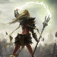 a female character. She is blonde and wearing a costume that appears to be inspired by ancient or magical attire, complete with armor pieces and a cape. Her pose suggests she may be casting a spell or performing some sort of