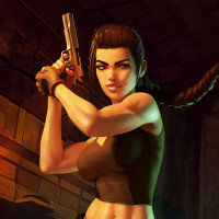 The image shows a female character who appears to be Lara Croft, known from the Tomb Raider video game series. She is holding a pistol and seems to be in a challenging or adventurous setting with greenish-blue lighting that creates an atmospheric effect around her.