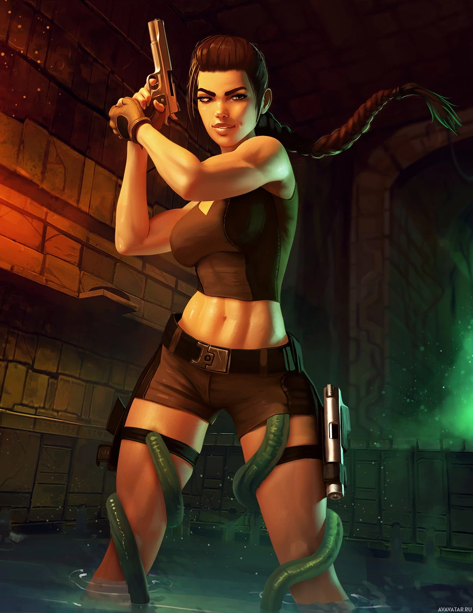 На картинке изображена женщина-персонаж, которая выглядит как Лара Крофт, известная по серии видеоигр Tomb Raider. Она держит пистолет и, кажется, находится в сложной или авантюрной обстановке с зеленовато-голубым освещением, которое создает атмосферный эффект вокруг нее.