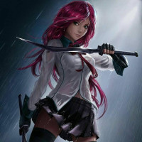 soaked ground and darkened atmosphere. The character has a confident posture with one hand on her hip and the sword held ready, giving off