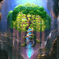 a fantastical scene with a vibrant green tree as the central focus. This tree is situated in a rocky cave or canyon setting, characterized by steep walls and narrow passageways that lead towards