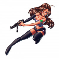 brown hair holding a gun. She is wearing black knee-high boots and has